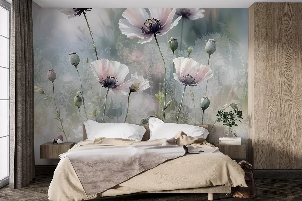 Carta da parati Delicati papaveri rosa e viola con steli e boccioli verdi su uno sfondo morbido e sfuocato nr. w08585