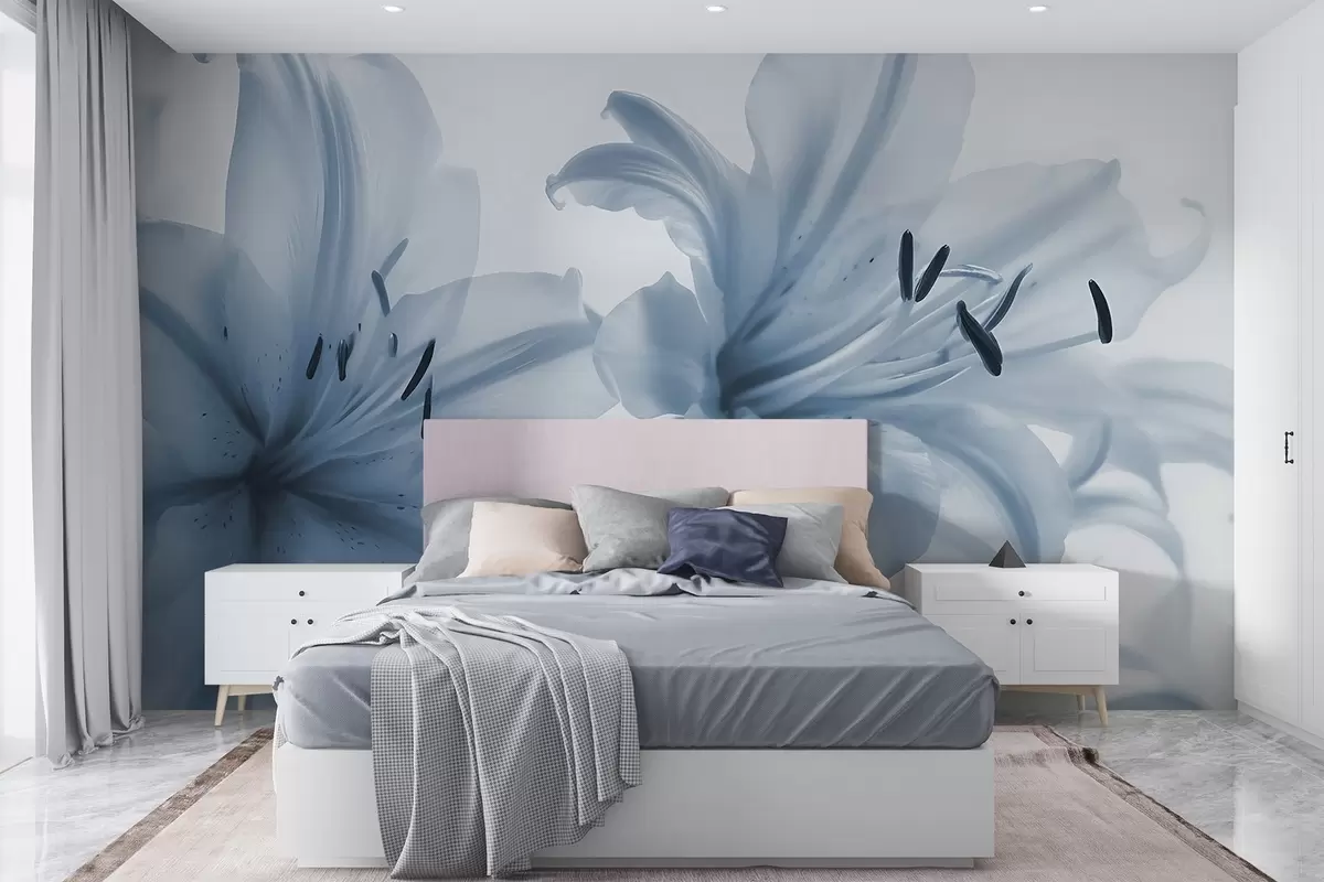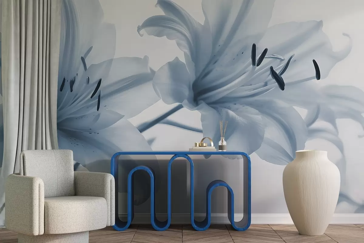 Carta da parati Primo piano soft focus di fiori di giglio blu minimalista su uno sfondo chiaro nr. w08586