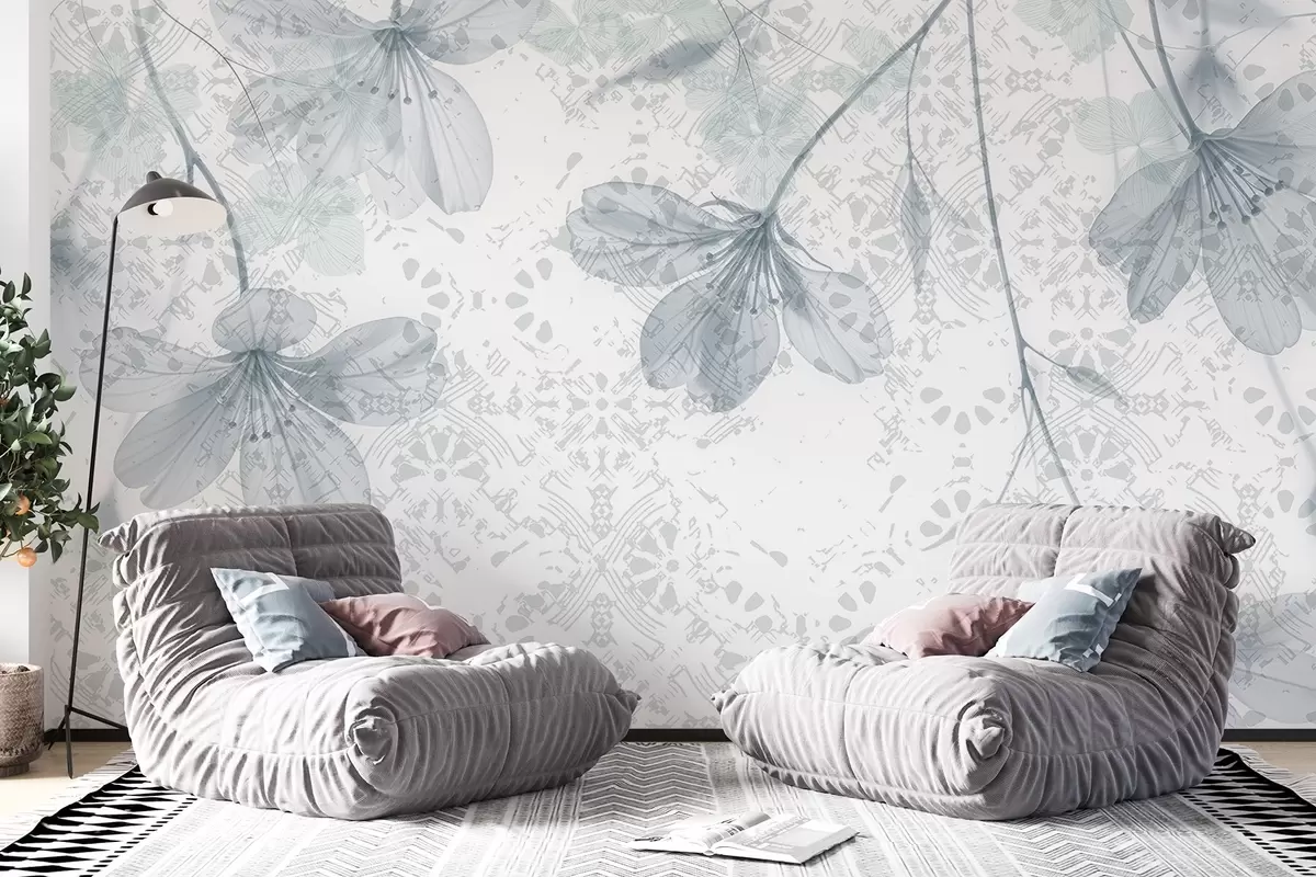 Carta da parati Delicati fiori bianchi e blu con lunghi steli e petali su uno sfondo morbido e sfocato nr. w08588