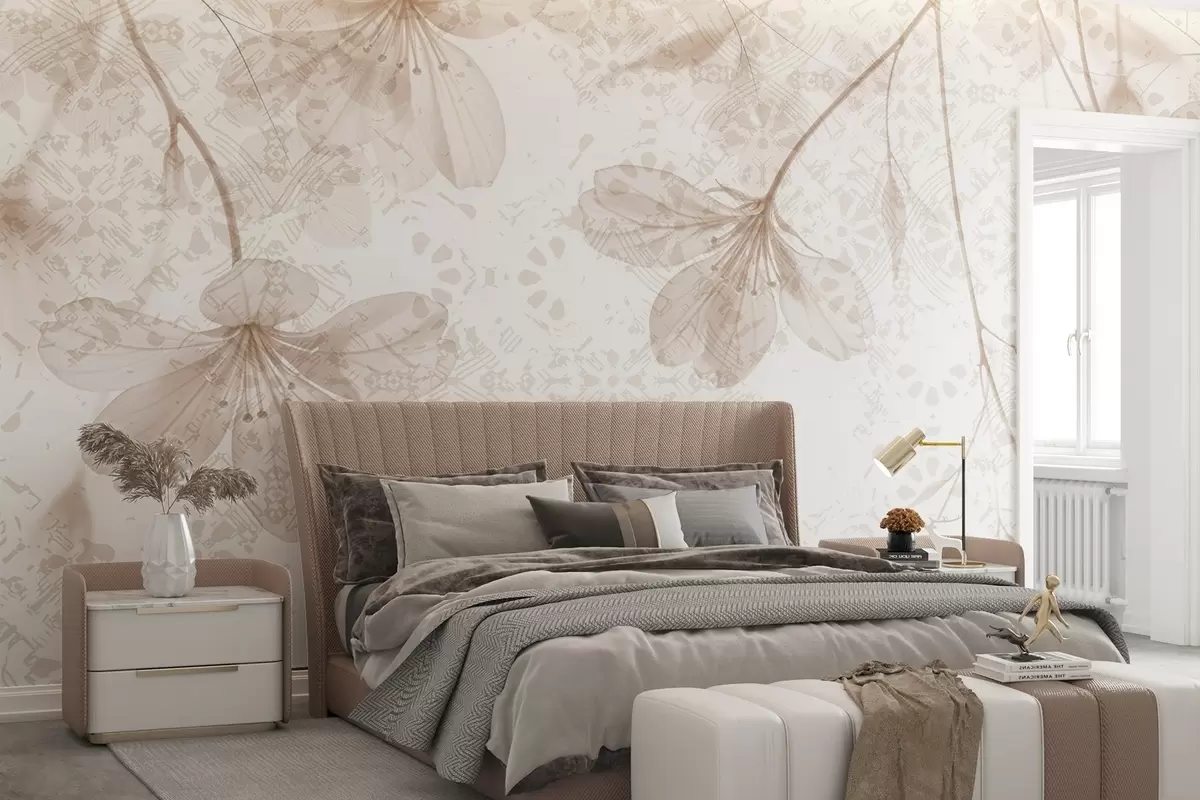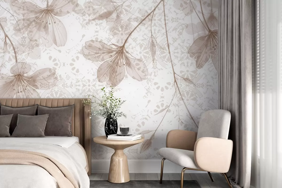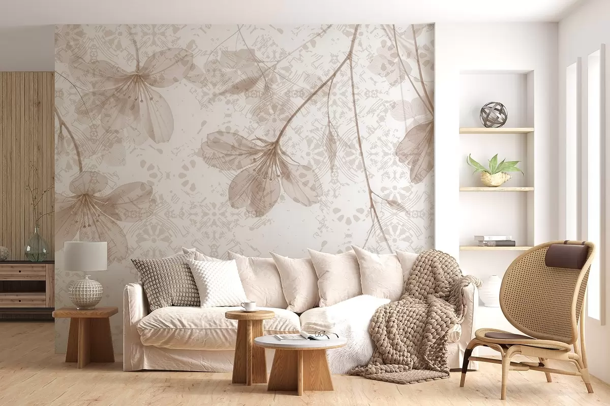 Carta da parati Delicati fiori bianchi e beige con lunghi steli e petali su uno sfondo morbido e sfocato nr. w08588v1