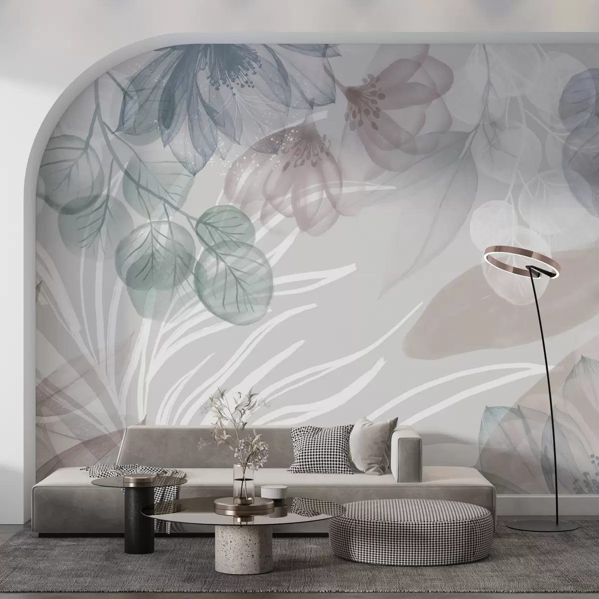 Carta da parati Stampa floreale color pastello con grandi fiori e foglie astratte trasparenti nei toni del grigio, del rosa e del verde nr. w08600