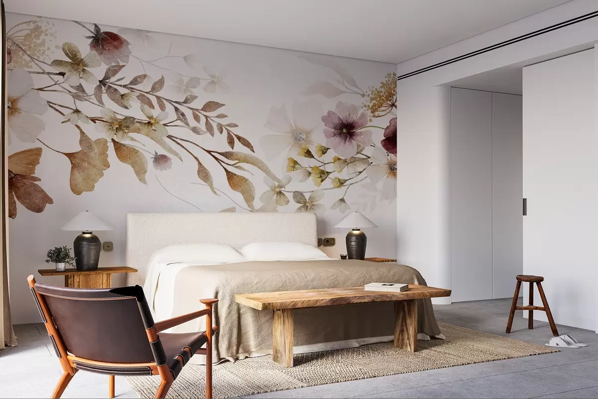 Carta da parati Composizione floreale dai colori tenui e sfumati con fiori e foglie beige e bianchi su uno sfondo chiaro nr. w08603