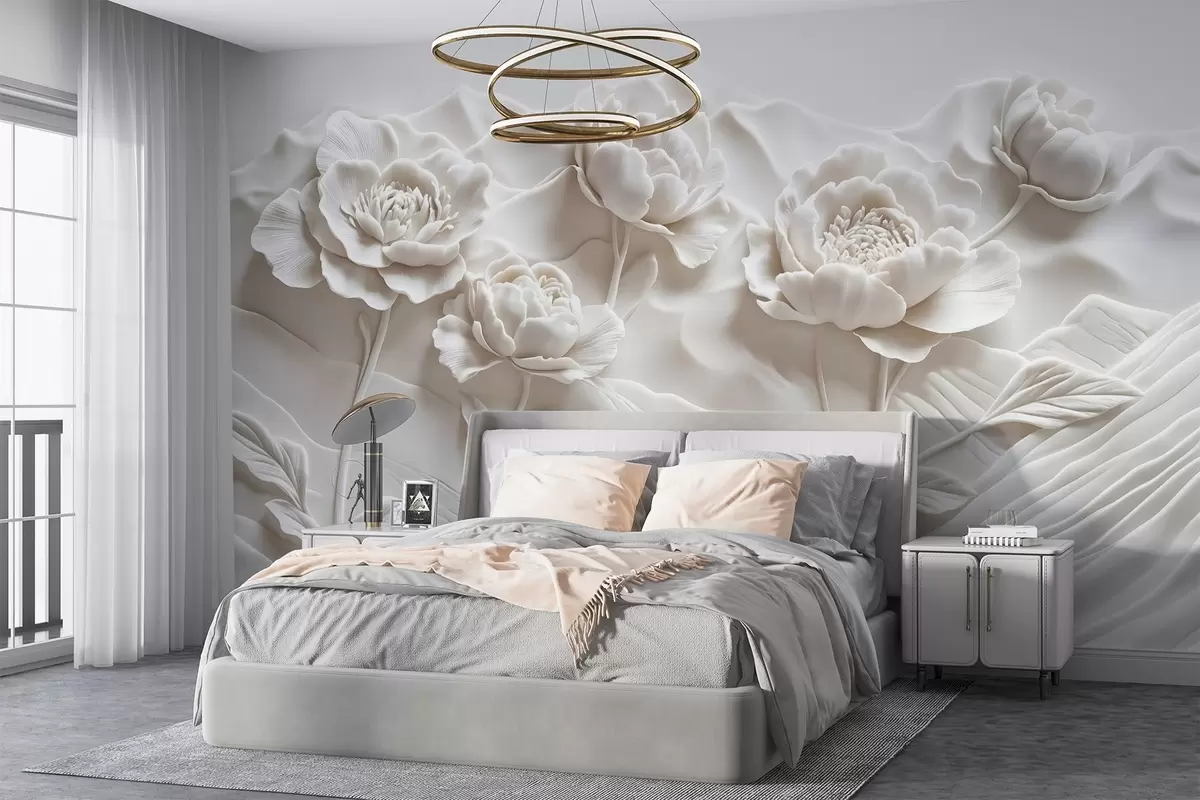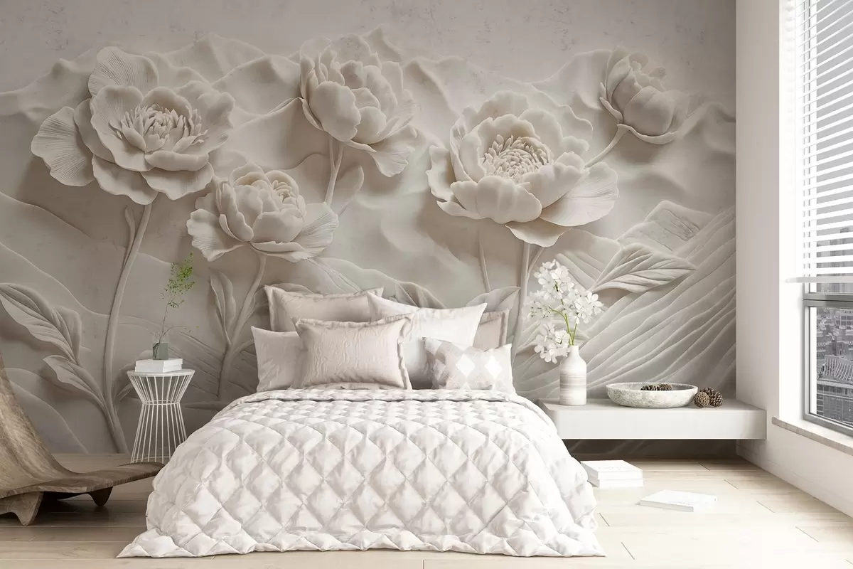 Carta da parati Imitazione floreale bianca di una scultura in rilievo con grandi fiori di peonia dettagliati su uno sfondo semplice nr. w08612