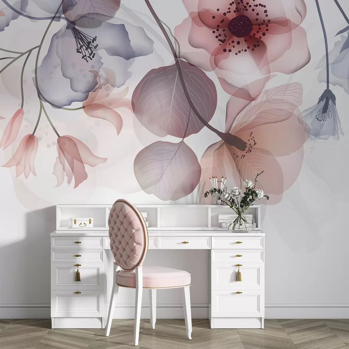 Carta da parati Delicati fiori traslucidi rosa e grigi con petali morbidi e centri scuri, su uno sfondo chiaro nr. w08613