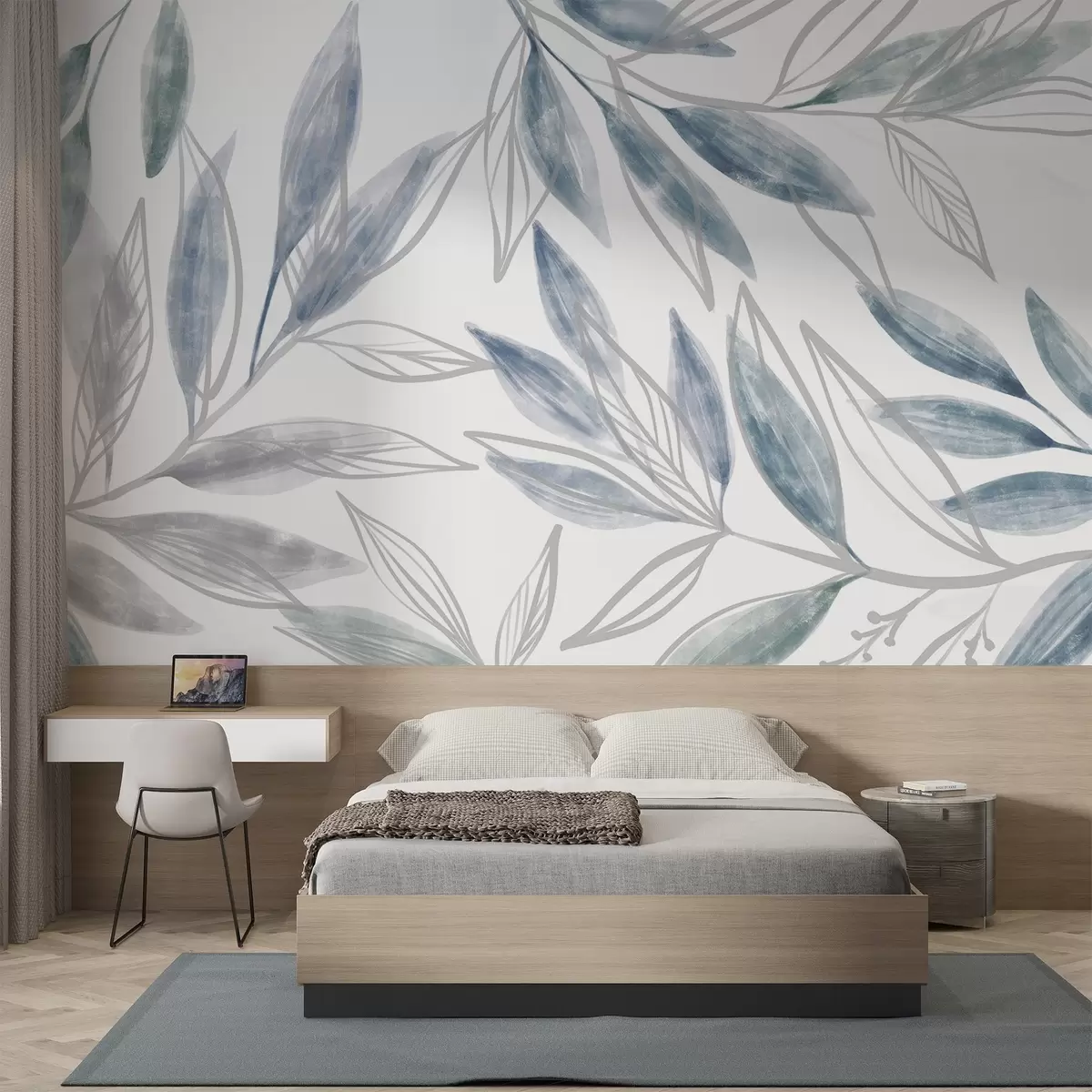 Carta da parati Delicate foglie pastello blu e grigie, che creano una composizione botanica serena e minimalista nr. w08642v1