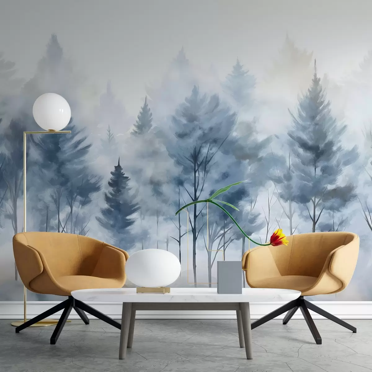 Carta da parati Un paesaggio forestale nebbioso con alti pini e alberi spogli di latifoglie in primo piano acquerello imitazione arte nr. w08643
