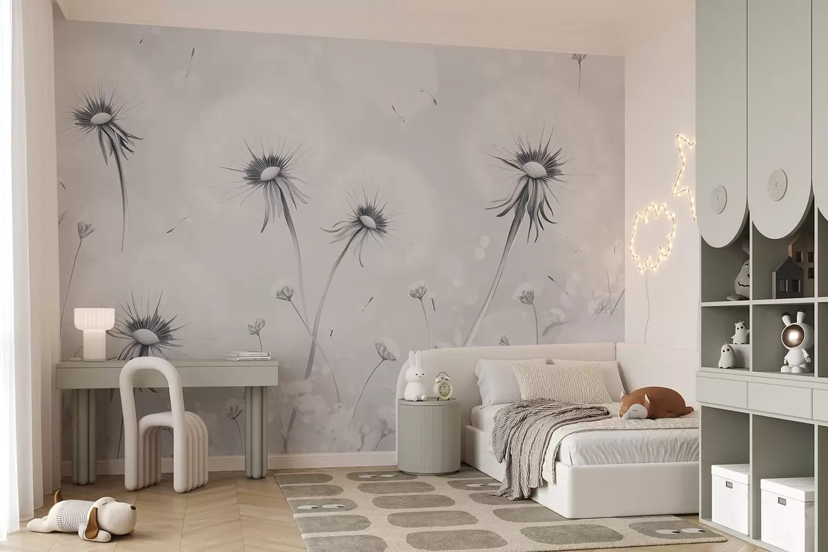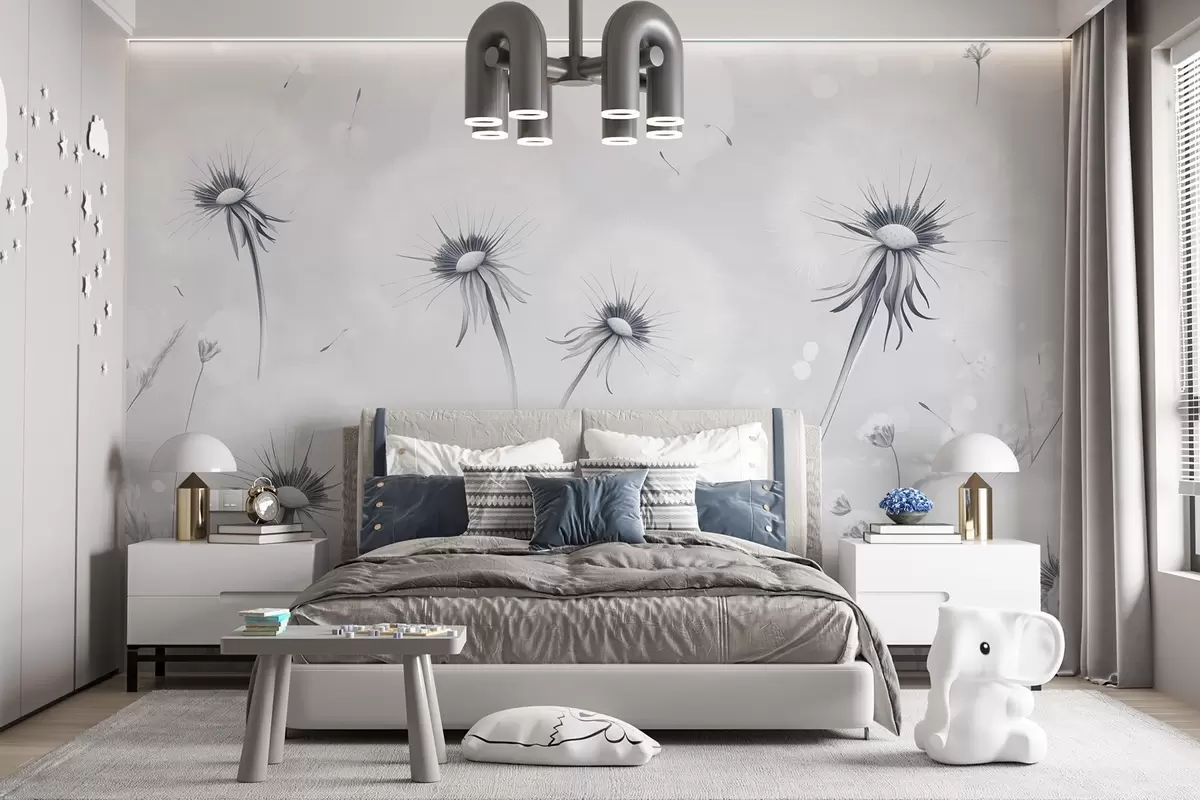 Carta da parati Eleganti denti di leone e fiori di campo in stile pittorico nei toni del blu nr. w08657v2