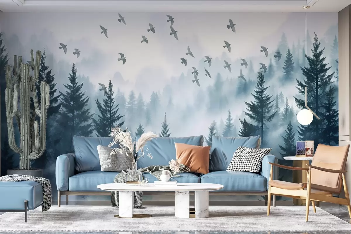 Carta da parati Tranquilla foresta nebbiosa con alberi dai toni del blu e stormi di uccelli in volo nel cielo nr. w08664