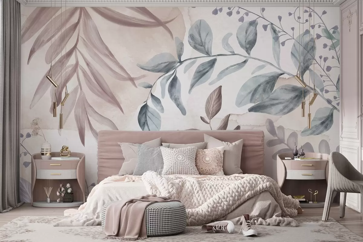 Carta da parati Stampa botanica con foglie e rami floreali in tenui colori pastello, su sfondo acquerellato nr. w08668