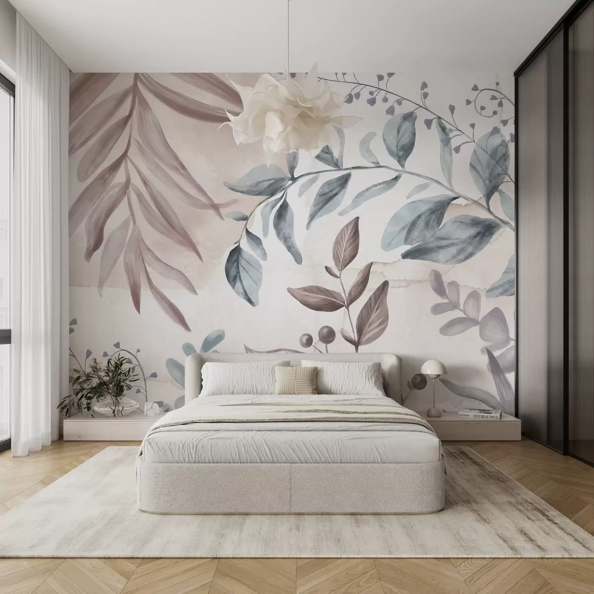 Carta da parati Stampa botanica con foglie e rami floreali in tenui colori pastello, su sfondo acquerellato nr. w08668