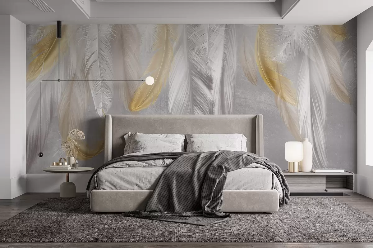 Carta da parati Piume bianche e gialle sospese su un morbido sfondo grigio, per una composizione delicata e ariosa nr. w08670