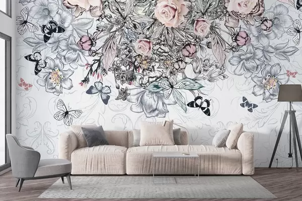 Carta da parati Un disegno floreale con rose rosa e vari fiori e farfalle con un'intricata line art su sfondo strutturato nr. w08674