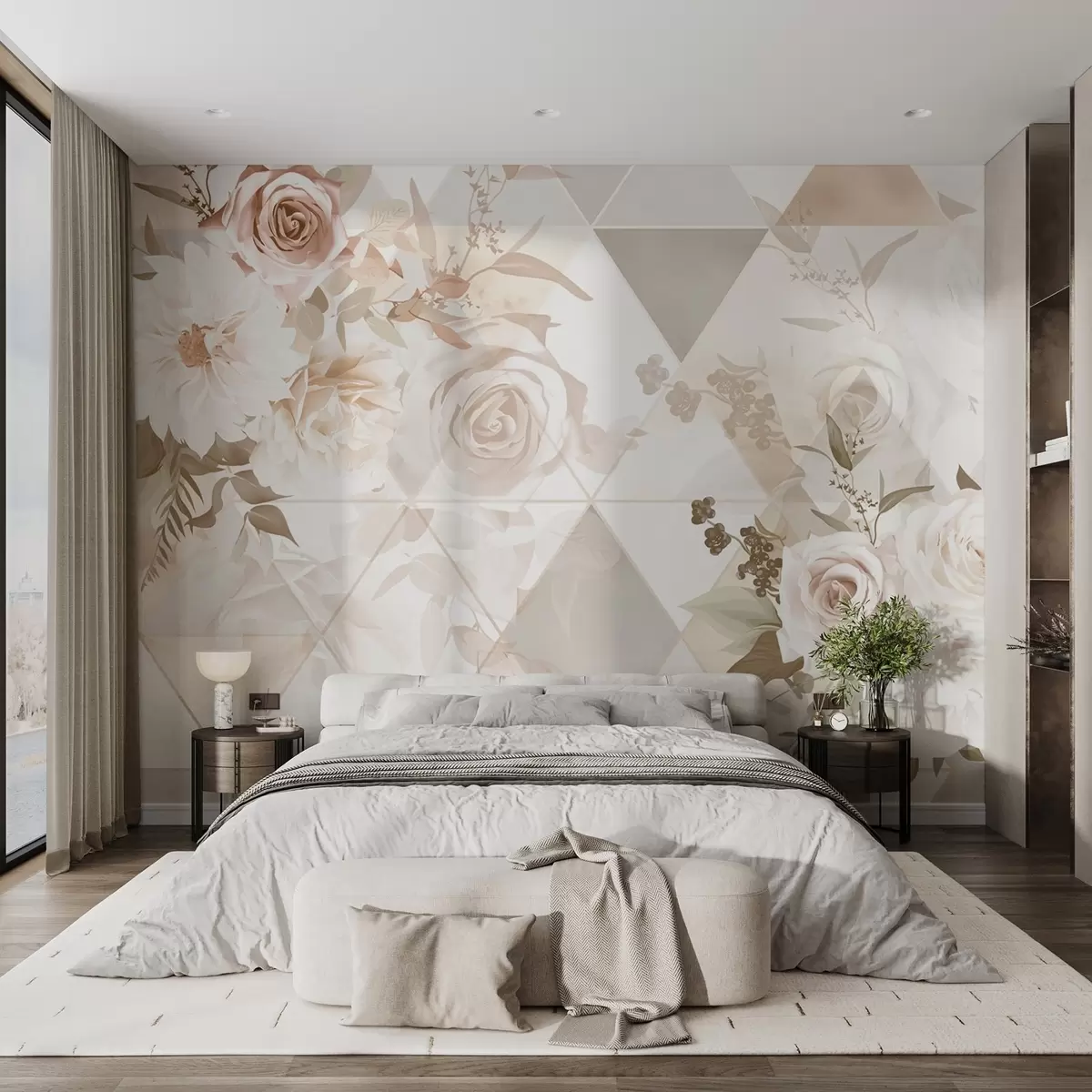 Carta da parati Bouquet di rose e peonie su uno sfondo a fantasia nei toni del beige chiaro nr. w08679