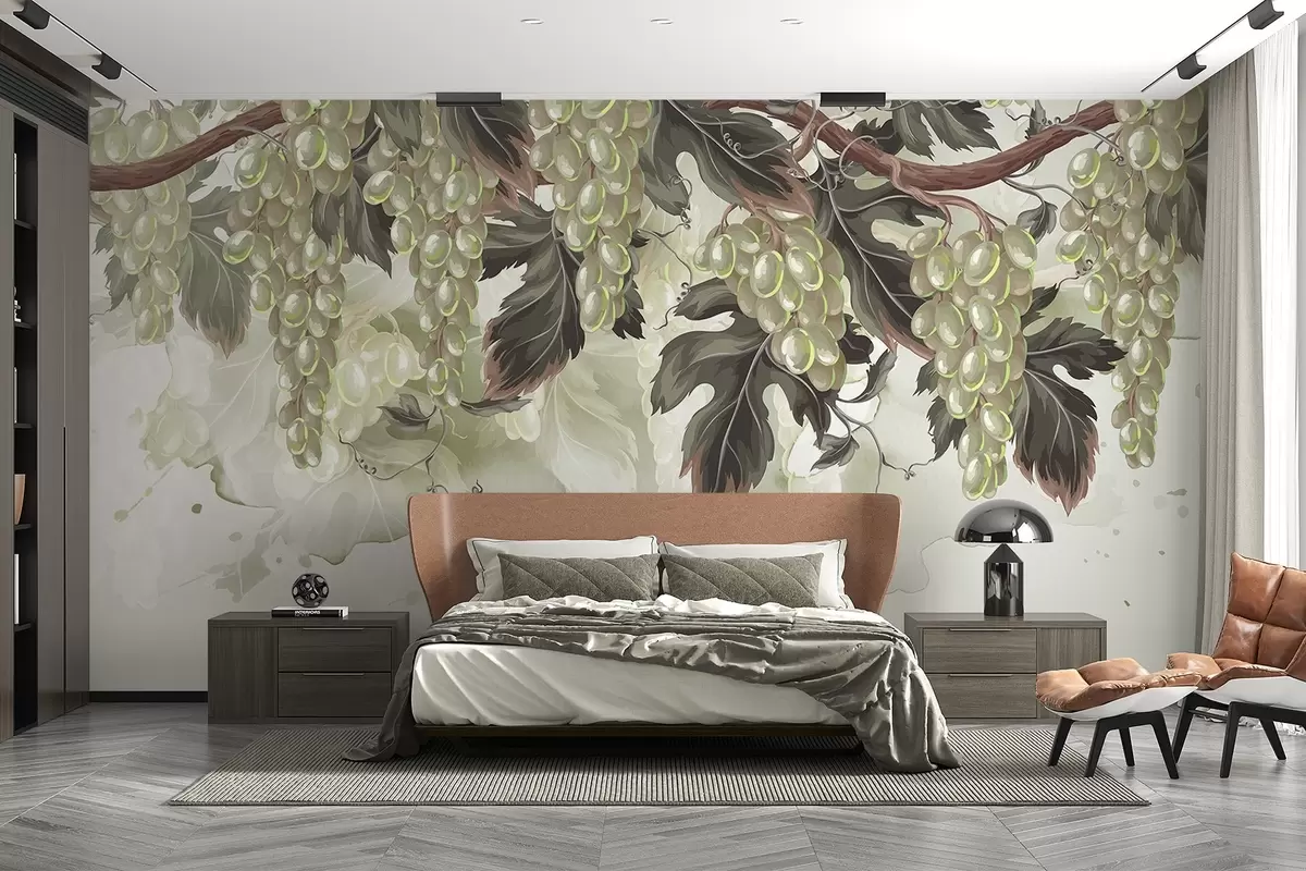 Carta da parati Uva appesa a una vite con foglie verdi, su uno sfondo chiaro con texture acquerellata nr. w08696