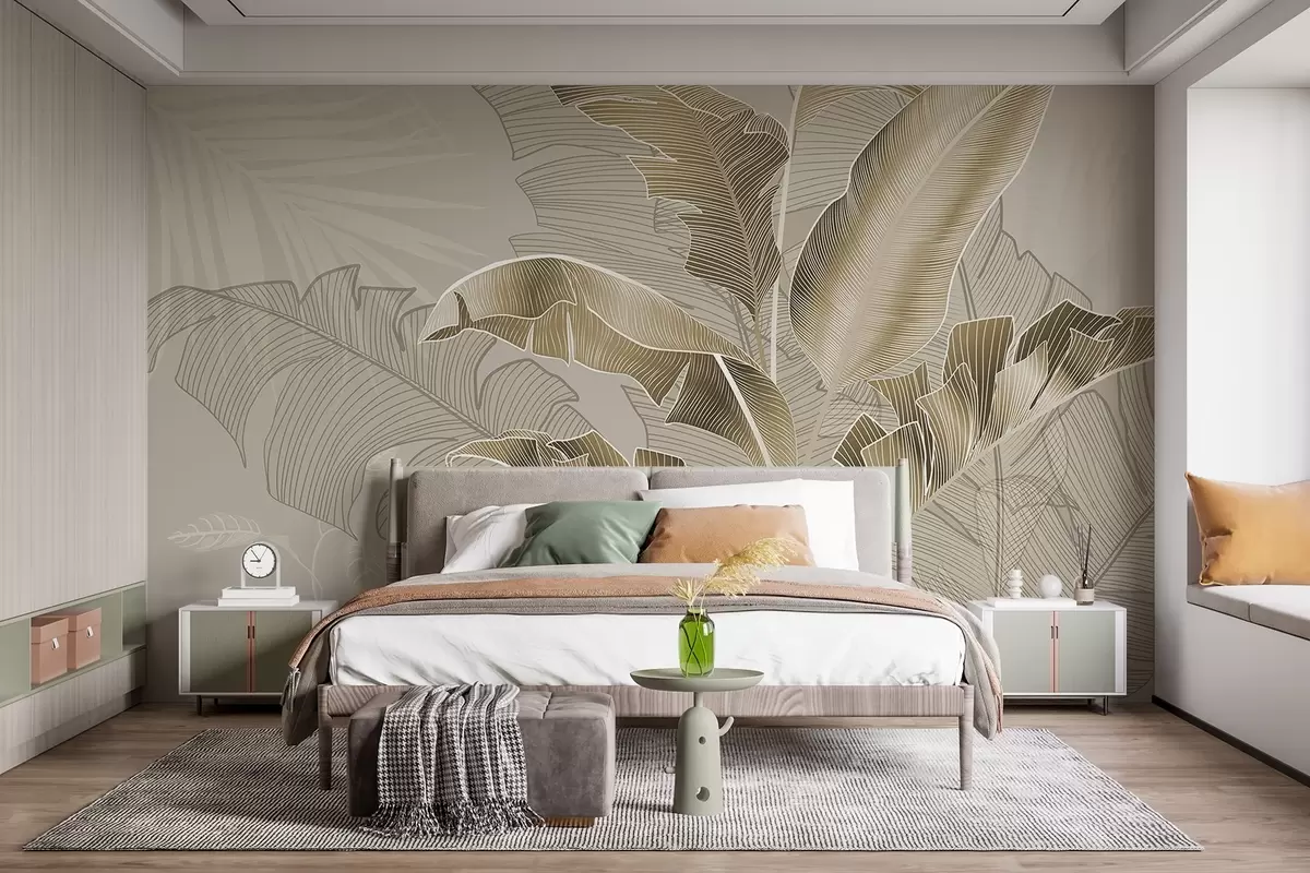 Carta da parati Un'armoniosa composizione di foglie tropicali nei toni del beige e del marrone, caratterizzata da un dettagliato lavoro di linee nr. w08698