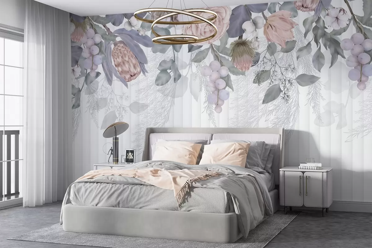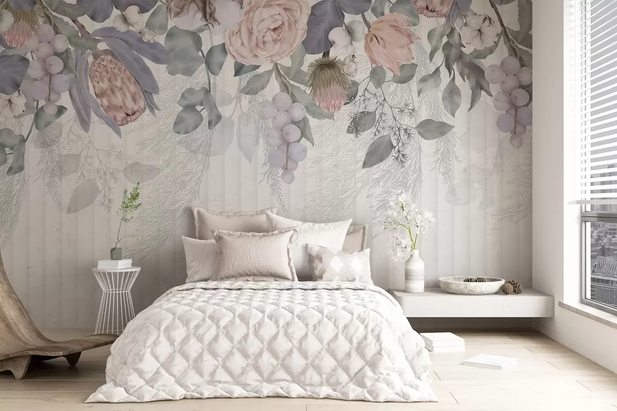 Carta da parati Un fiore di rose rosa dai colori pastello, fiori di protea, rami di eucalipto e bacche su sfondo strutturato nr. w08700