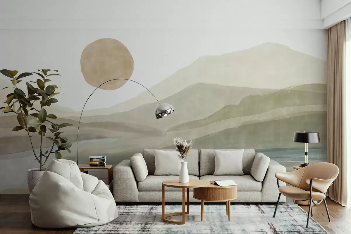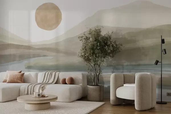Carta da parati Un paesaggio di montagne stratificate con una leggera pendenza, un fiume tortuoso, un sole arancione tenue nel cielo.. nr. w08702
