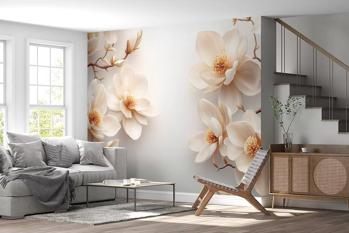 Carta da parati Bella fioritura di fiori di magnolia color crema su sfondo bianco nr. w08704