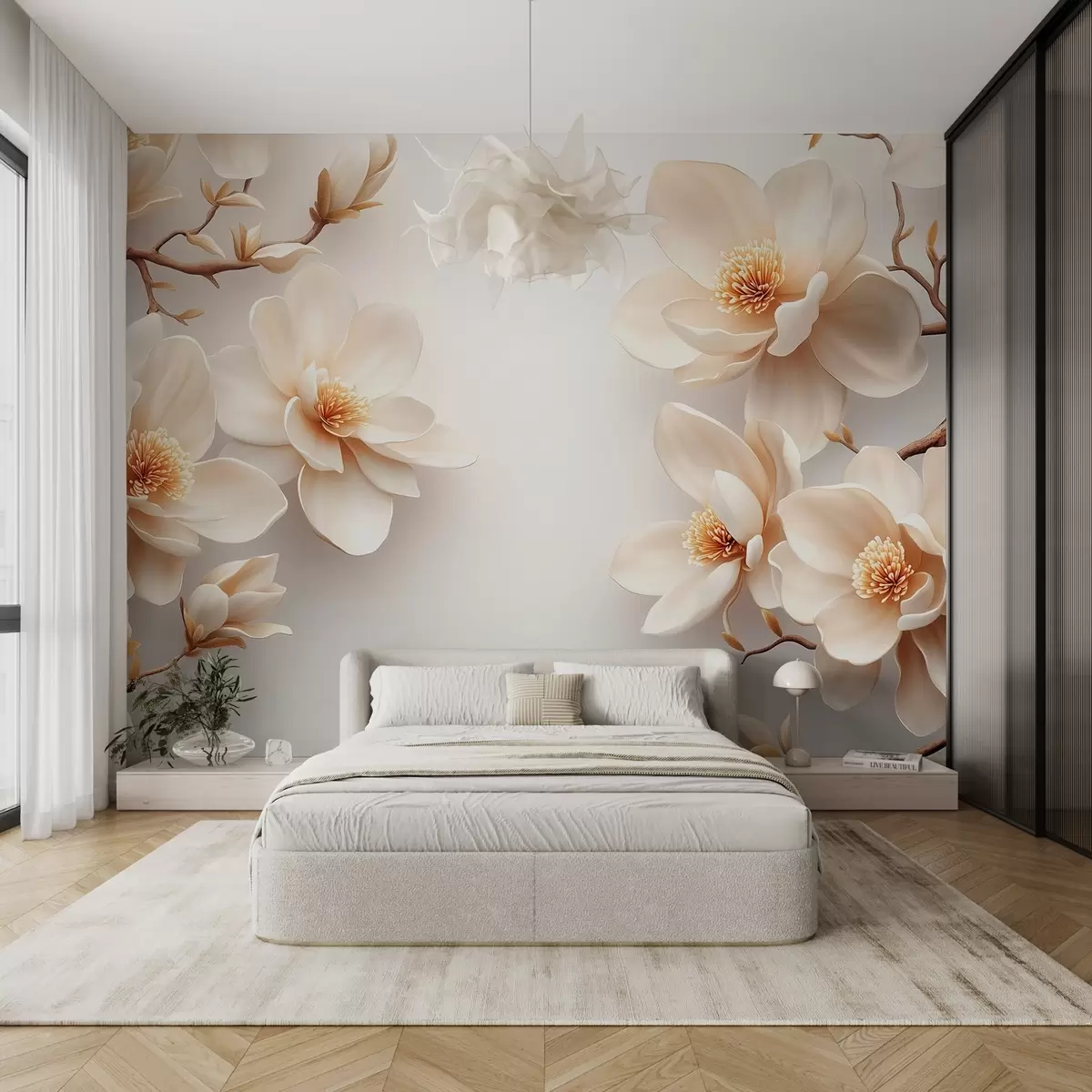 Carta da parati Bella fioritura di fiori di magnolia color crema su sfondo bianco nr. w08704