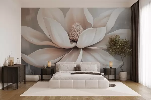 Carta da parati Elegante fiore di magnolia con petali lunghi e lisci su un morbido sfondo grigio nr. w08705
