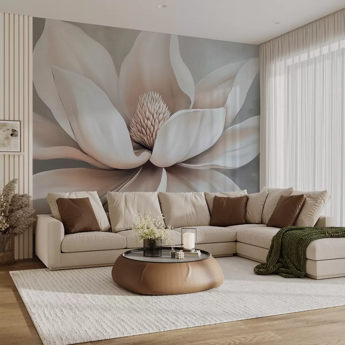 Carta da parati Elegante fiore di magnolia con petali lunghi e lisci su un morbido sfondo grigio nr. w08705
