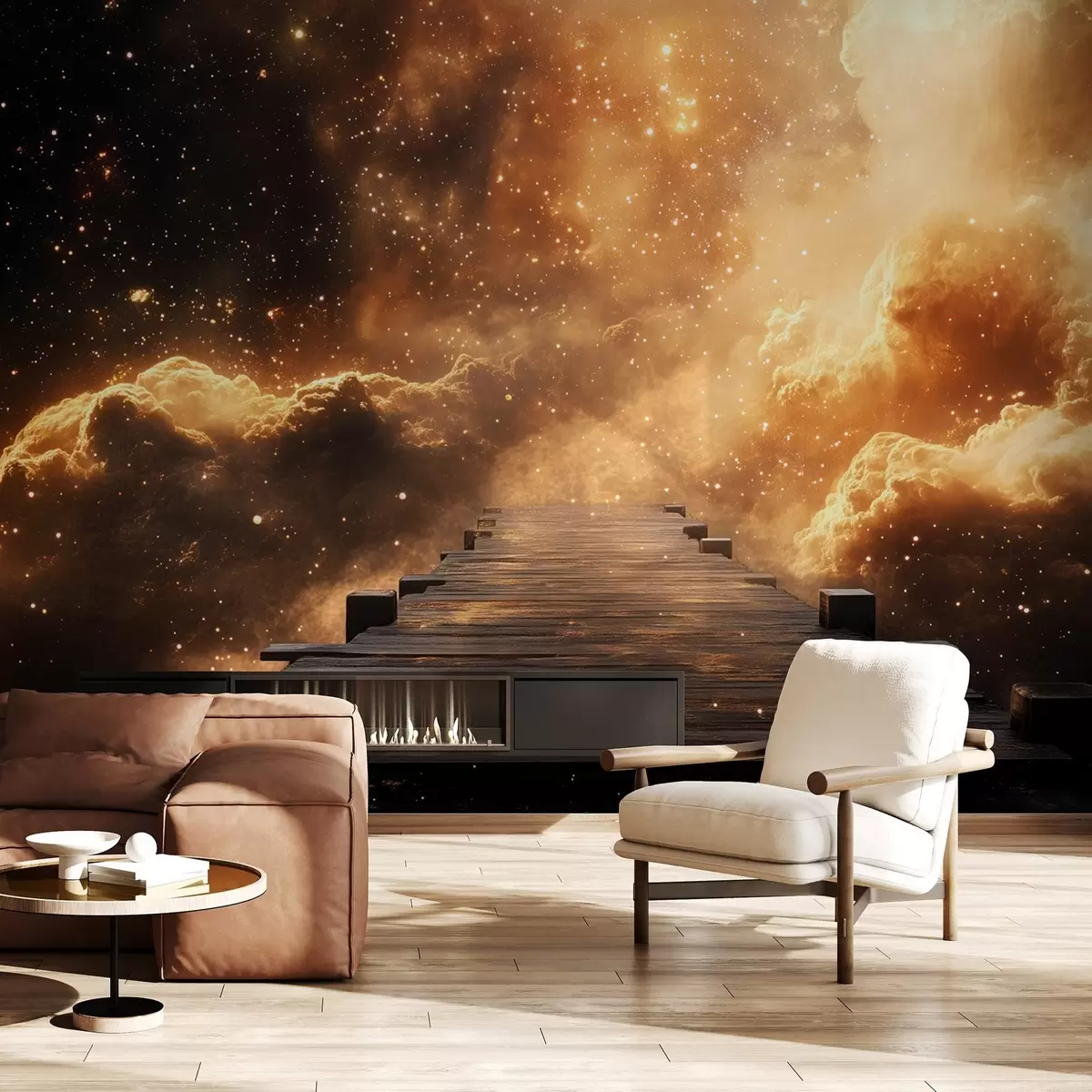 Carta da parati Cielo stellato giallo-nero cosmico con molo di legno nr. w08723