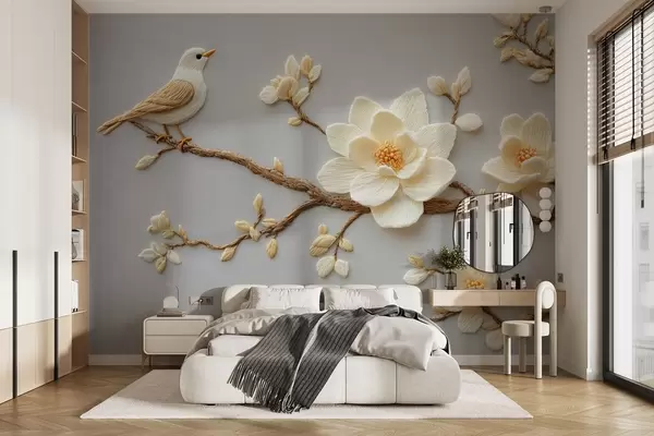 Carta da parati In stile fiori di magnolia ricamati con un uccello su un ramo su sfondo azzurro nr. w08724