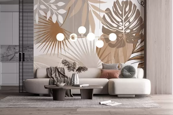 Carta da parati Disegno astratto con varie foglie tropicali e toni terrosi di marrone, beige e crema nr. w08738