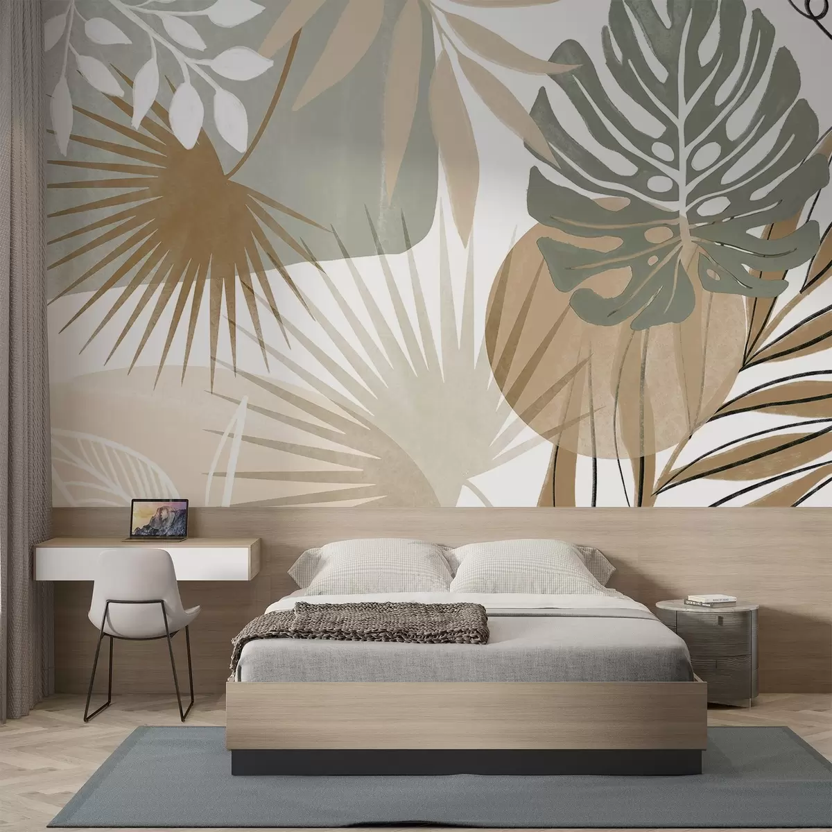 Carta da parati Disegno astratto con varie foglie tropicali e toni terrosi di verde, beige e crema nr. w08738v1