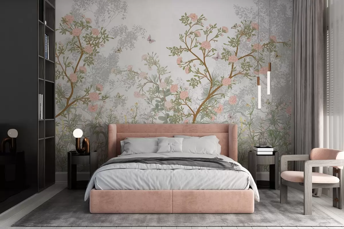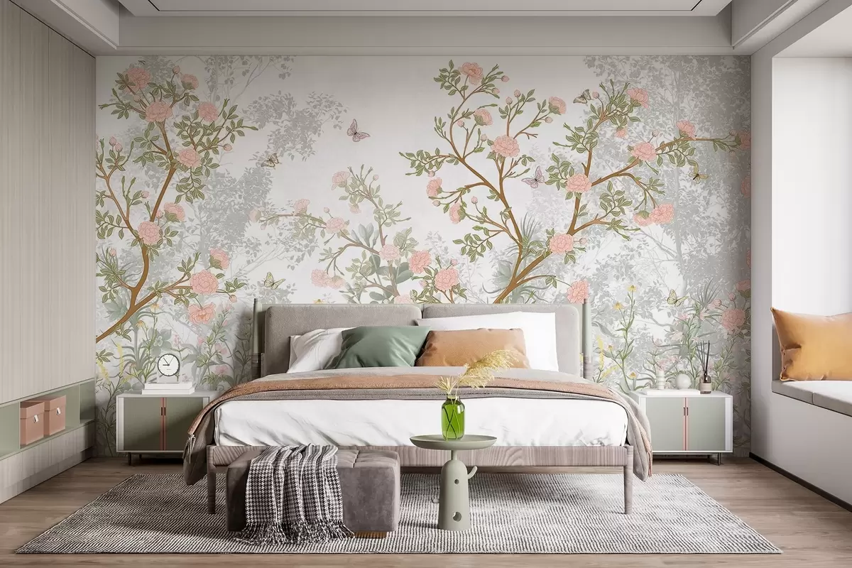 Carta da parati Delicati alberi in fiore rosa, farfalle volanti e foglie verdi intrecciate a rami sottili nr. w08744