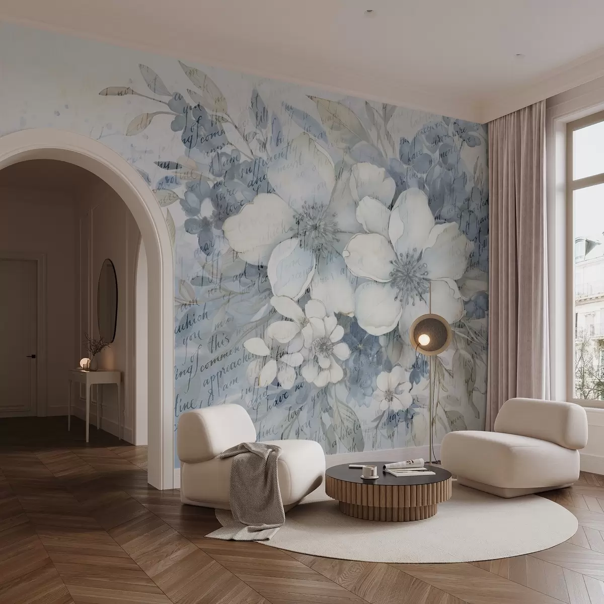 Carta da parati Una morbida imitazione murale con fiori bianchi e blu, su uno sfondo chiaro con un testo scritto a mano nr. w08771
