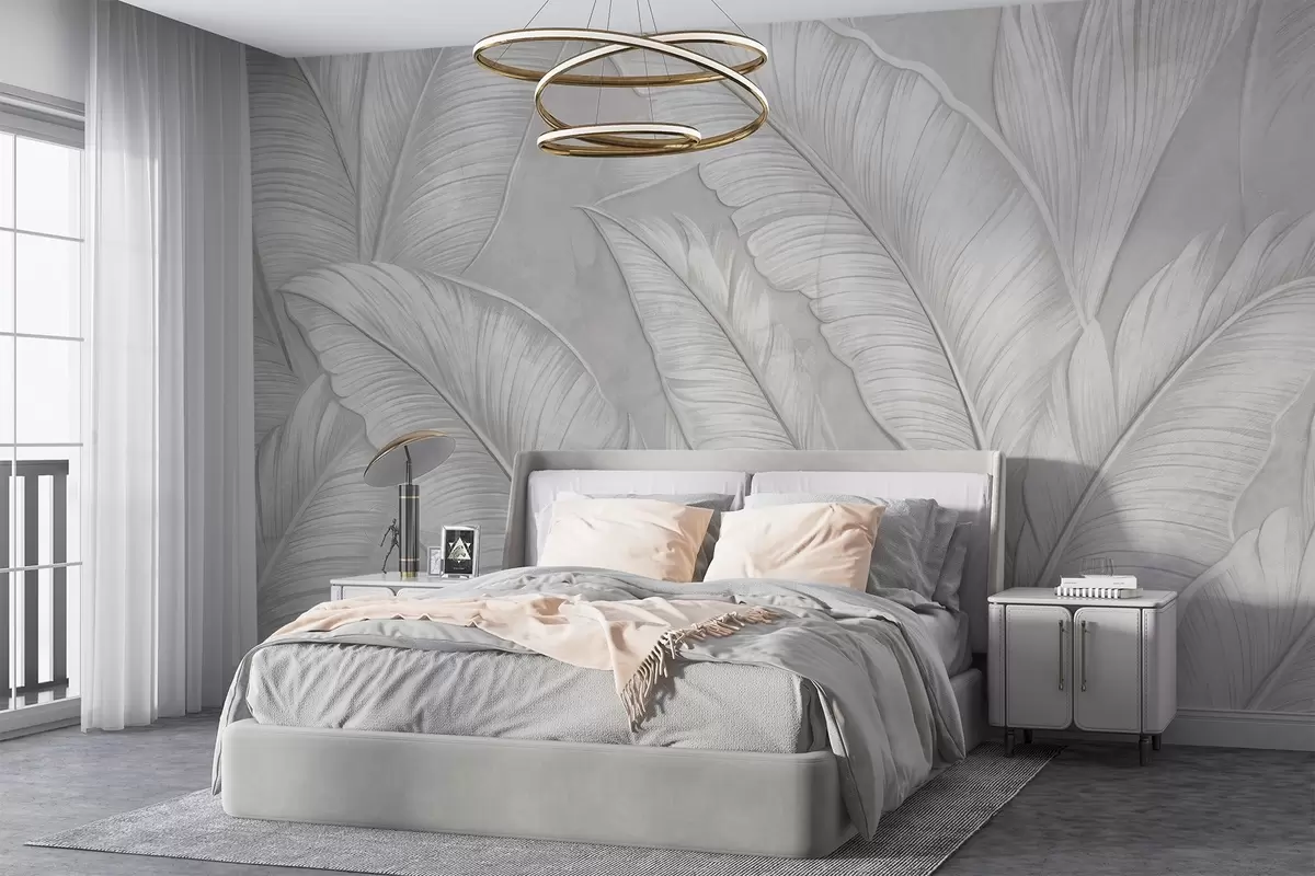 Carta da parati Foglie tropicali di grandi dimensioni, altamente strutturate e dettagliate, in un colore monocromatico grigio chiaro in stile loft nr. w08772