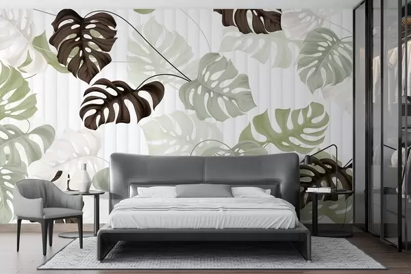 Carta da parati Foglie di Monstera nei toni del verde, del bianco e del marrone scuro, su uno sfondo chiaro a righe nr. w08773