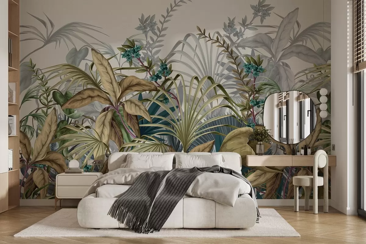 Carta da parati Composizione di varie piante tropicali con grandi foglie vivaci, che creano una scena di fogliame lussureggiante su un beige chiaro nr. w08777v1