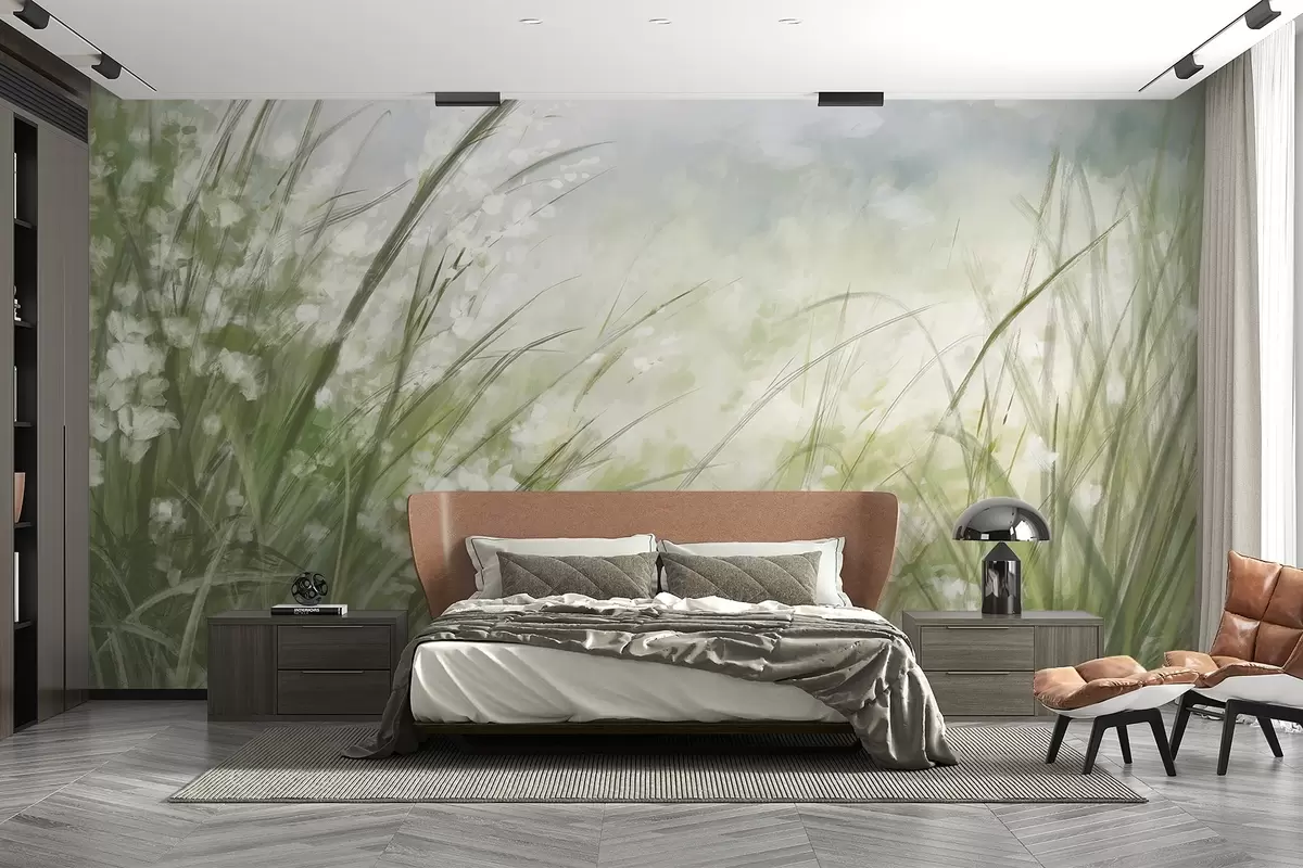 Carta da parati Erba verde con delicati fiori bianchi, stampa morbidamente sfocata con tonalità chiare, che crea un paesaggio tranquillo nr. w08779