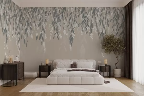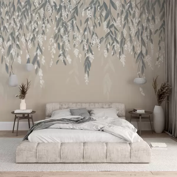 Carta da parati Rami di fogliame a cascata nei toni del verde tenue con fiori e foglie bianchi su sfondo beige nr. w08781