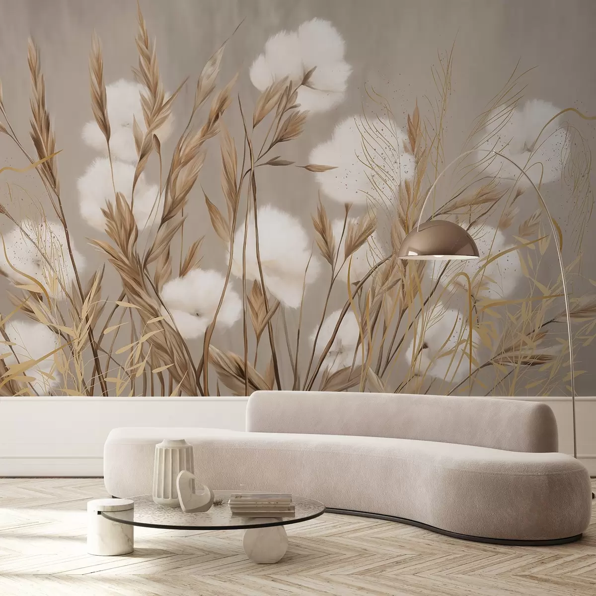 carta da parati Morbidi fiori bianchi in cotone e alte spighe arancioni su uno sfondo beige dalla texture tenue nr. w08784
