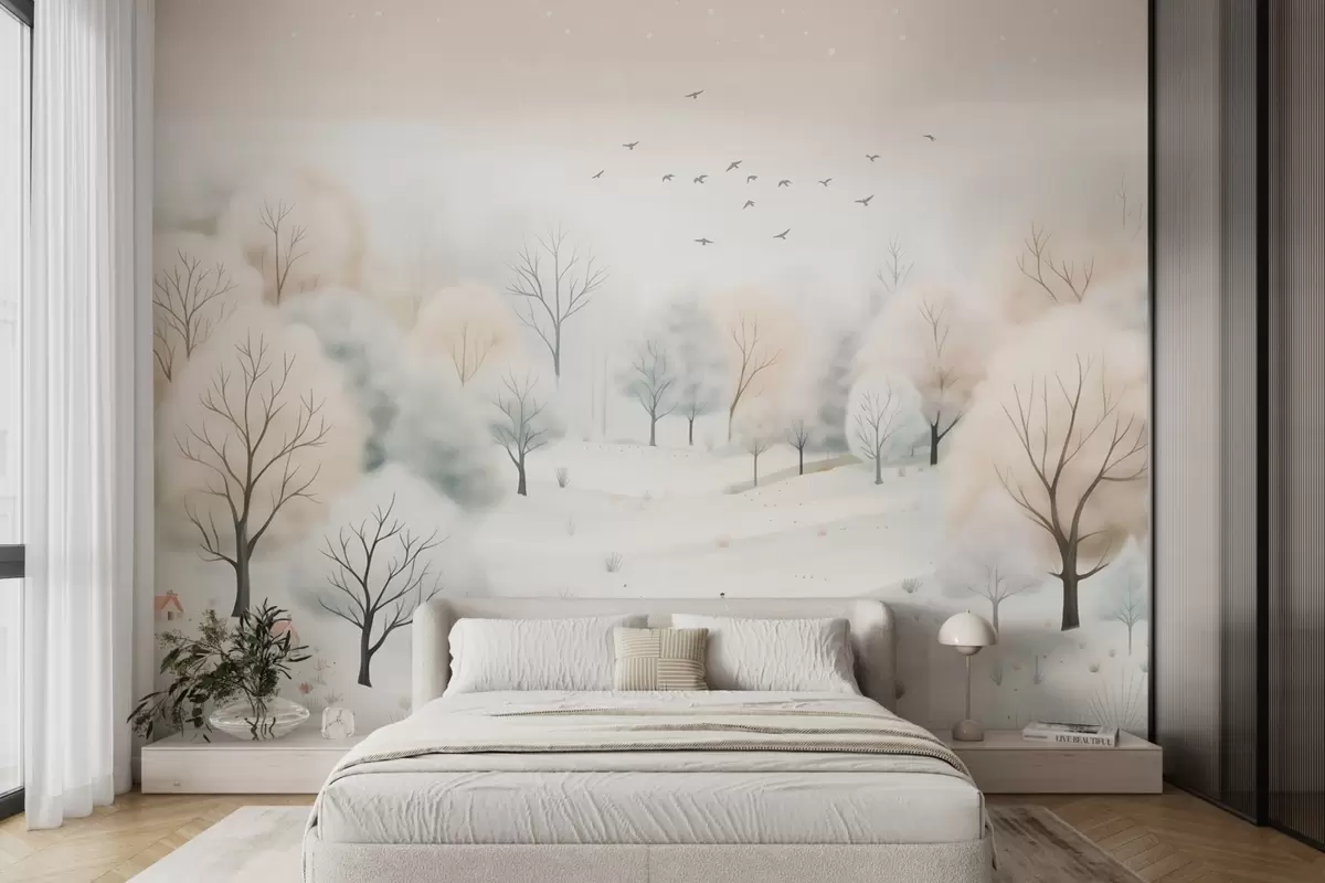 Carta da parati Foresta invernale con alberi, casette, uccelli e neve in un leggero stile acquerello nr. w08815