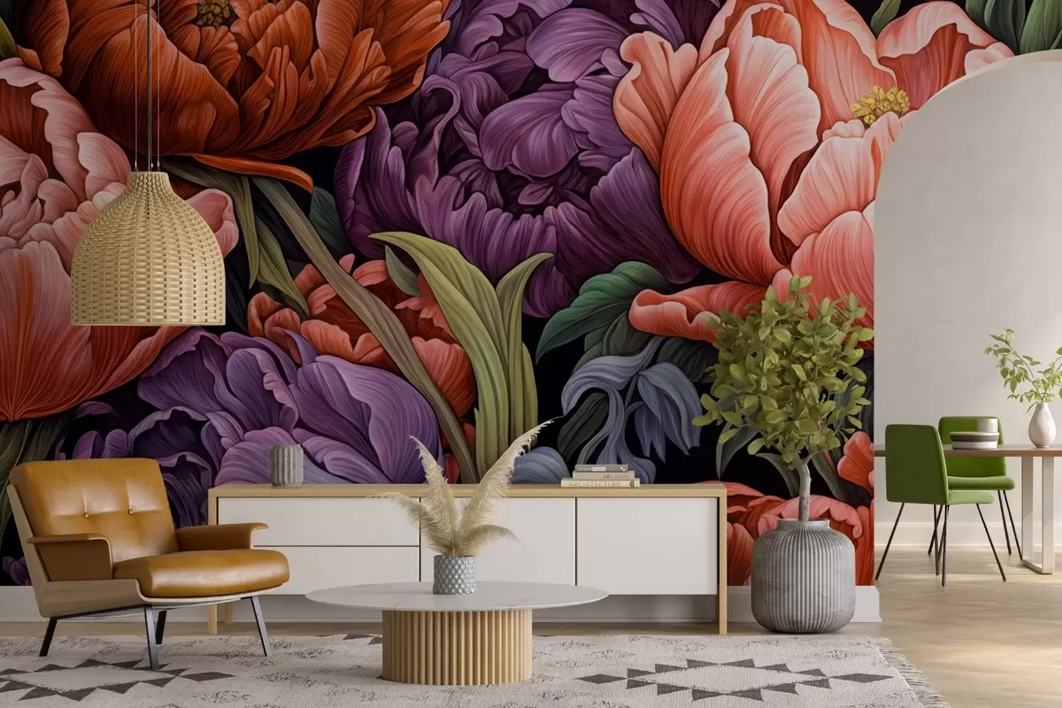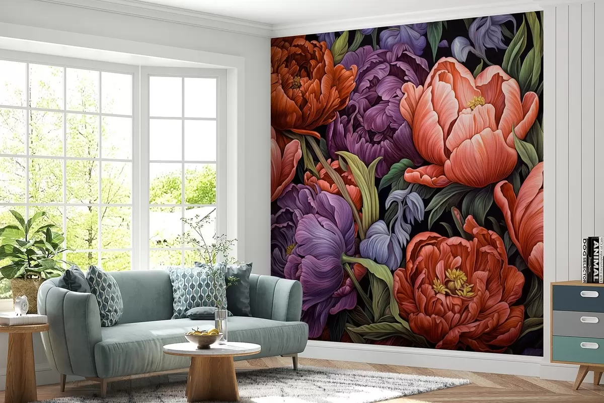 Carta da parati Tulipani e peonie in stile vittoriano, nei colori rosso e viola nr. w08818v1