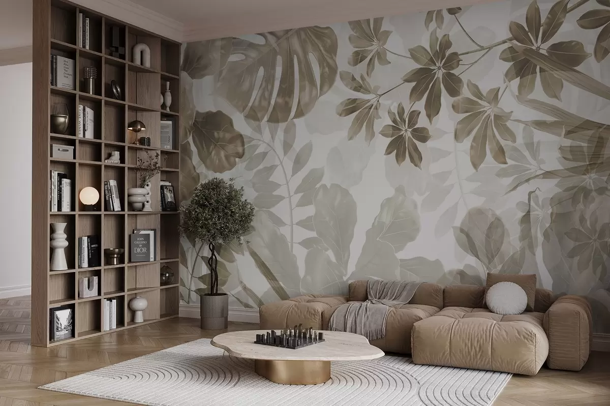 Carta da parati Foglie delicate beige tropicali su sfondo bianco nr. w08824