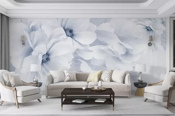 Carta da parati Fiori di peonia pastello con petali delicati bianchi e blu e linee bianche su sfondo azzurro nr. w08826