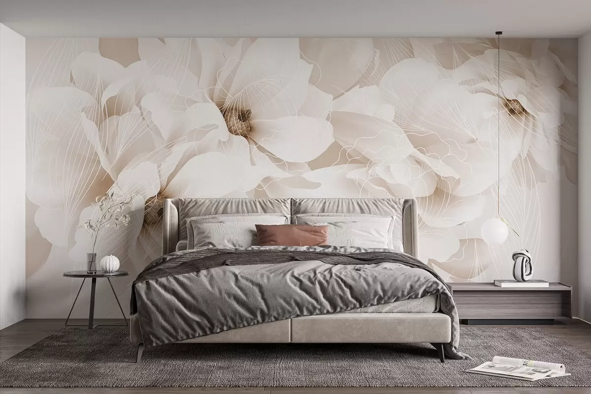 Carta da parati Fiori di peonia pastello con petali delicati bianchi e beige e linee bianche su sfondo beige chiaro nr. w08826v1