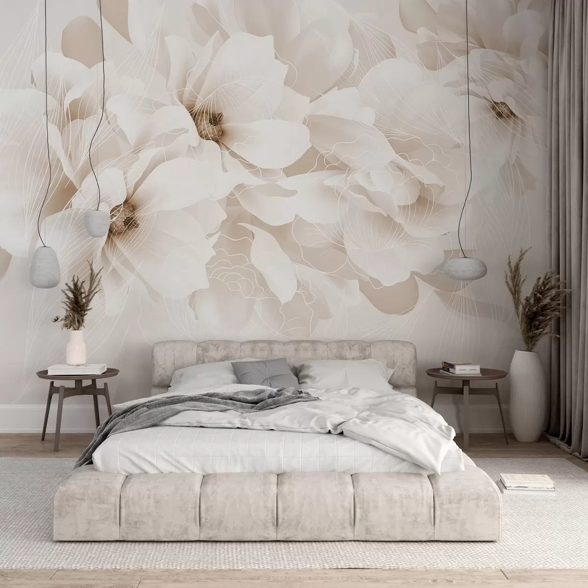 Carta da parati Fiori di peonia pastello con petali delicati bianchi e beige e linee bianche su sfondo beige chiaro nr. w08826v1
