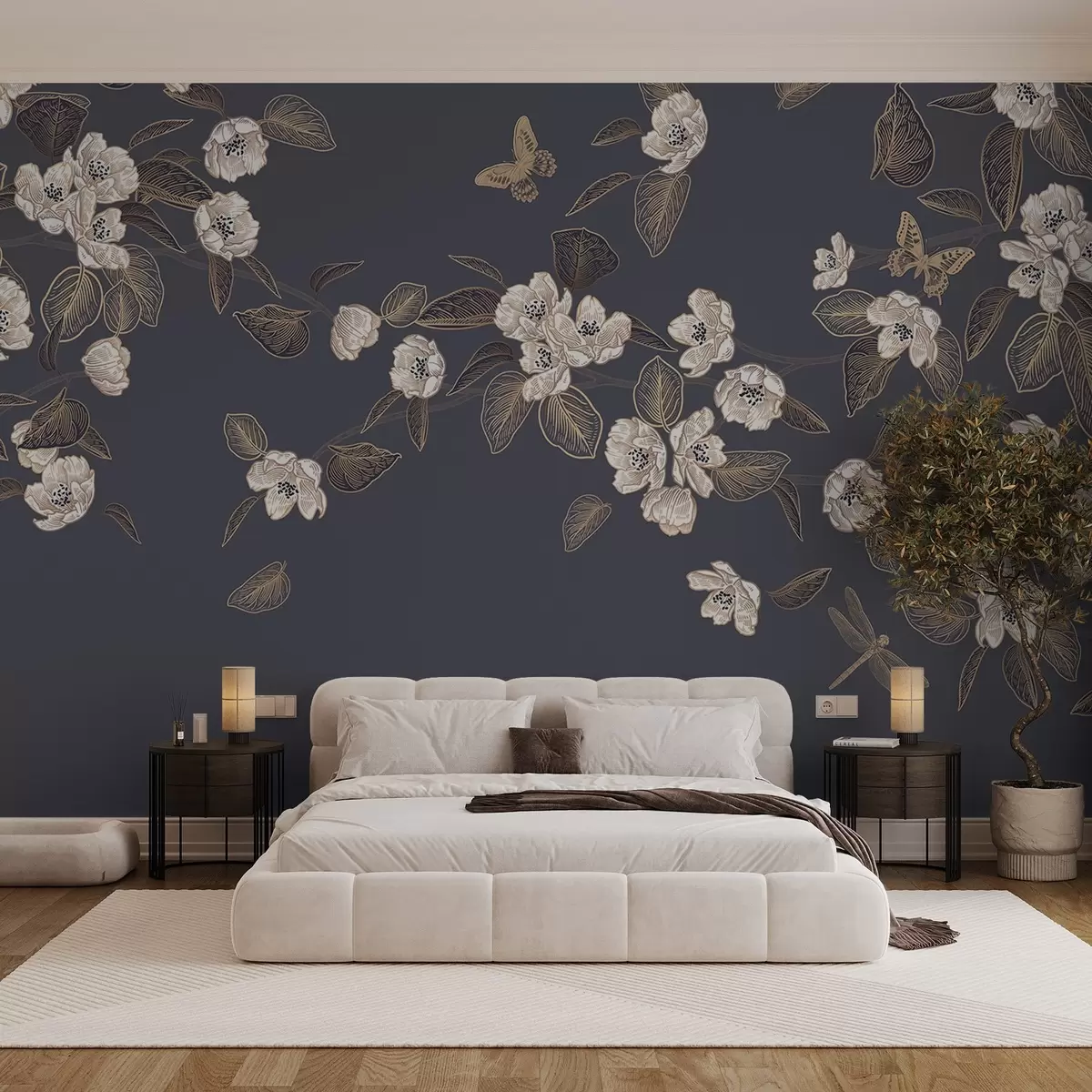 Carta da parati Ramo di ciliegio in fiore con fiori, foglie e farfalle su sfondo grigio scuro nr. w08830