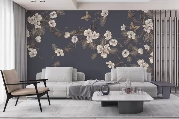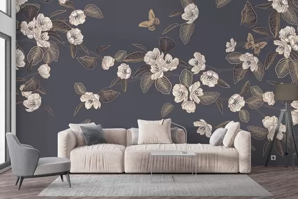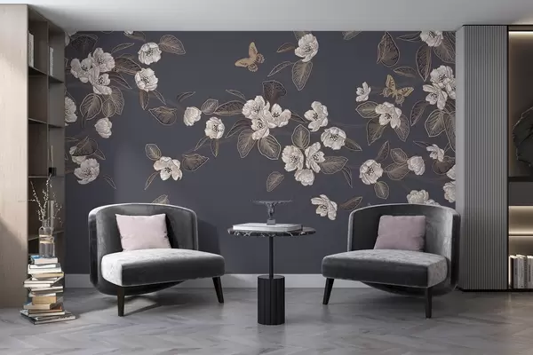 Carta da parati Ramo di ciliegio in fiore con fiori, foglie e farfalle su sfondo grigio scuro nr. w08830