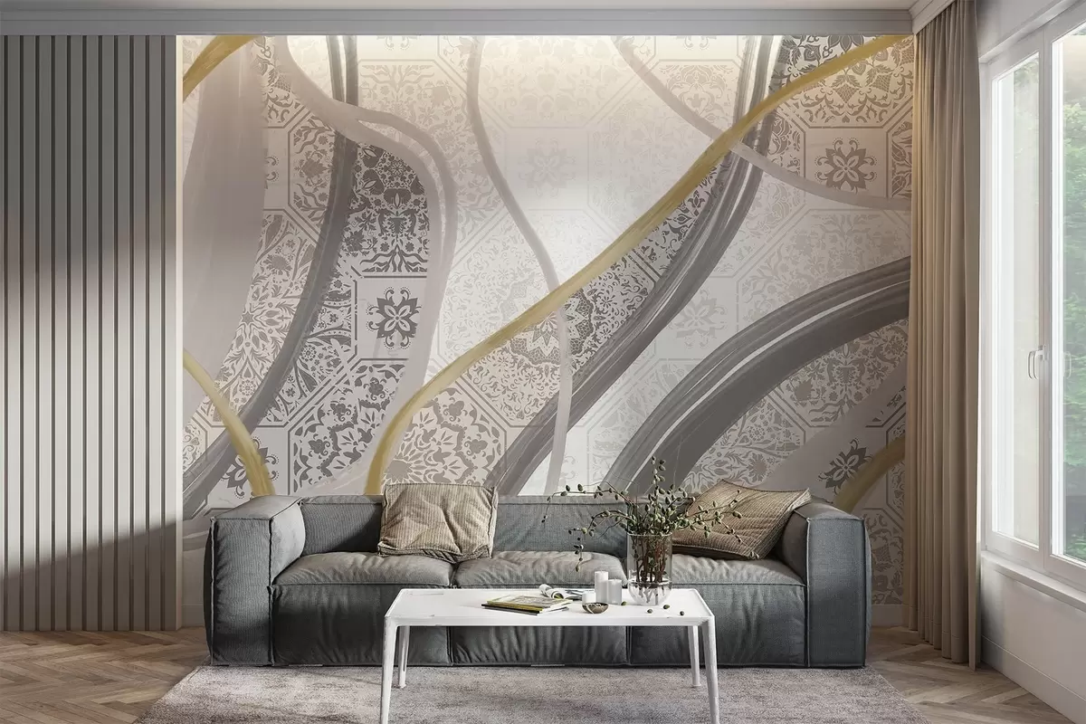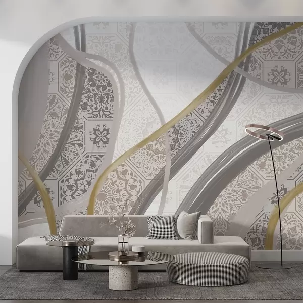 Carta da parati Quadro astratto con motivi geometrici e linee curve nei colori beige, grigio e giallo nr. w08837