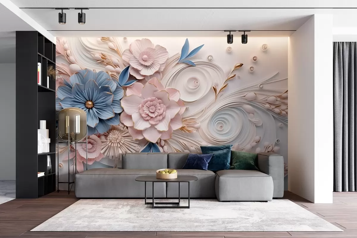 Carta da parati Una delicata composizione floreale nei toni del rosa e del blu con un morbido sfondo in rilievo nr. w08847