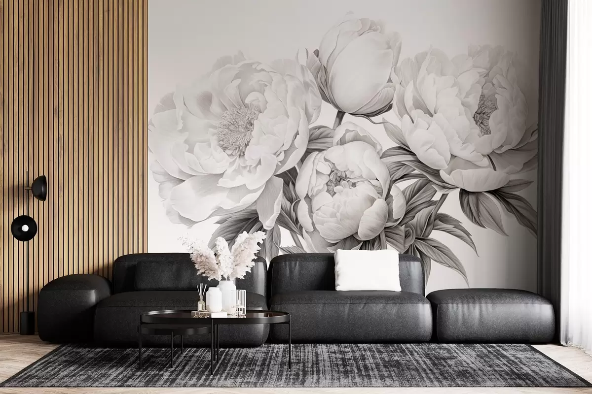 Carta da parati Peonie in bianco e nero in stile disegno a matita nr. w08852
