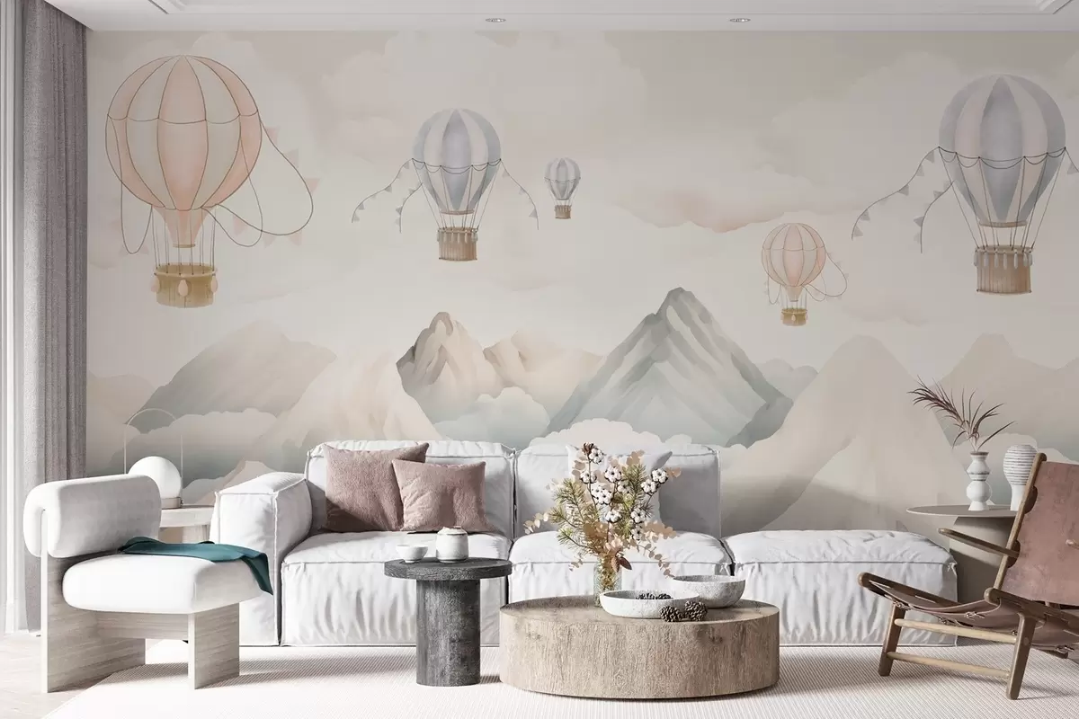 Carta da parati Mongolfiere che fluttuano sopra le montagne in tonalità neutre e pastello nr. w08853