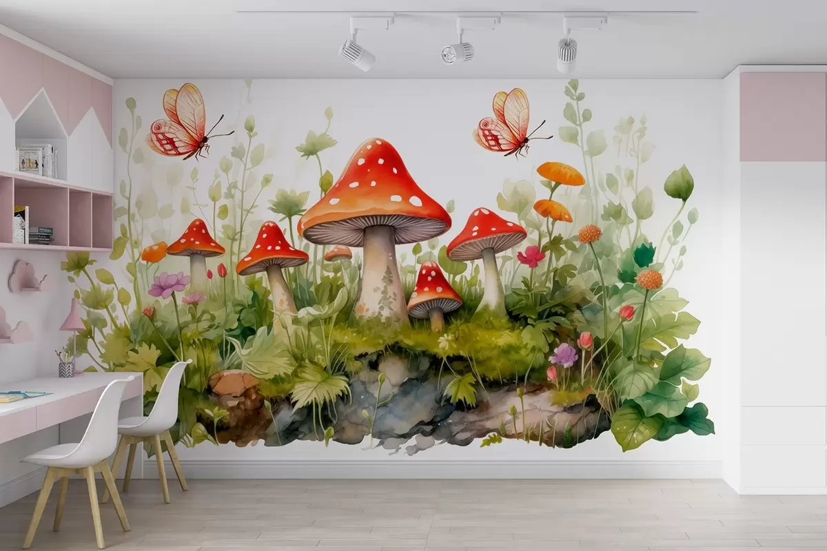 Carta da parati Un paesaggio forestale su sfondo bianco in stile acquerello con funghi, rane e farfalle nr. w08854